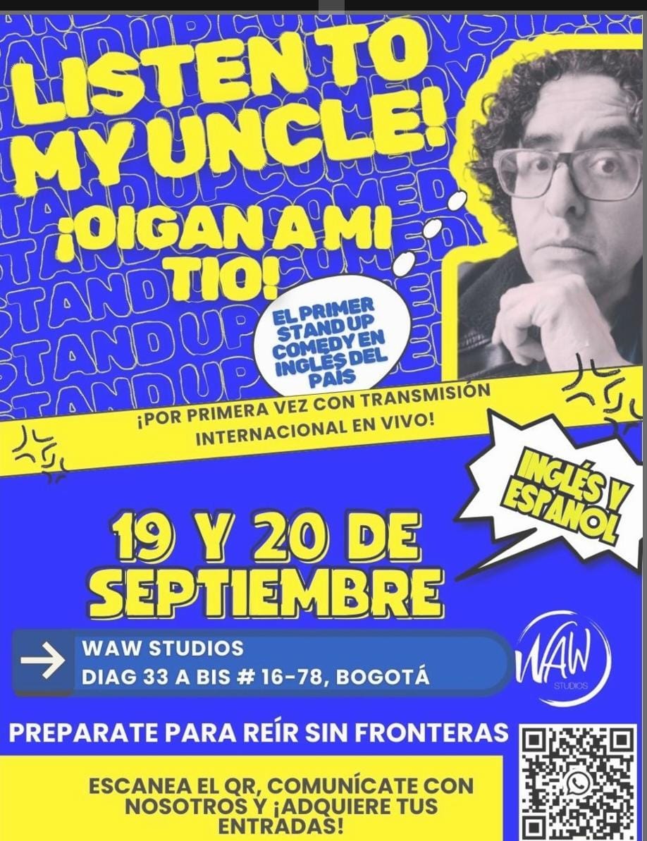 En un hecho sin precedentes para el humor nacional, llega el estreno de “LISTEN TO MY UNCLE – ¡OIGAN A MI TÍO!”, el primer stand-up comedy en inglés en Colombia, también con funciones en español, una propuesta irreverente, auténtica y profundamente cercana que celebra con mucho humor los tropiezos de aprender inglés en nuestro contexto latinoamericano. Escrito e interpretado por Nelson Pérez Rojas, docente y comediante con una mirada aguda sobre la cotidianidad educativa, este show es una radiografía hilarante de esas situaciones que todos hemos vivido: la pronunciación inentendible, los malentendidos gramaticales y las confusiones culturales que surgen en el camino de dominar un segundo idioma. “Listen to my uncle” —o su versión en español, “¡Oigan a mi tío!”— es mucho más que un monólogo: es una invitación a reconocernos en las experiencias del otro, a reírnos de nuestros errores y a entender que el aprendizaje también puede ser un acto profundamente liberador y cómico. Inspirado en sus años de enseñanza en colegios, universidades y otros espacios formativos del país, Nelson Pérez Rojas convierte su experiencia como profesor en un repertorio de anécdotas tan absurdas como entrañables, con una capacidad única de conectar con el público, sin importar su nivel de inglés. Una función bilingüe, divertida y refrescante que se presentará los días 19 y 20 de septiembre, marcando un nuevo hito en el humor nacional. Descargue el material de prensa AQUÍ “LISTEN TO MY UNCLE, OIGAN A MI TIO” En función el viernes 19 y sábado 20 de septiembre WAW Studio Diagonal 33a Bis #16-78, Bogotá Informes y reservas en el teléfono WhatsApp: 315 2430707