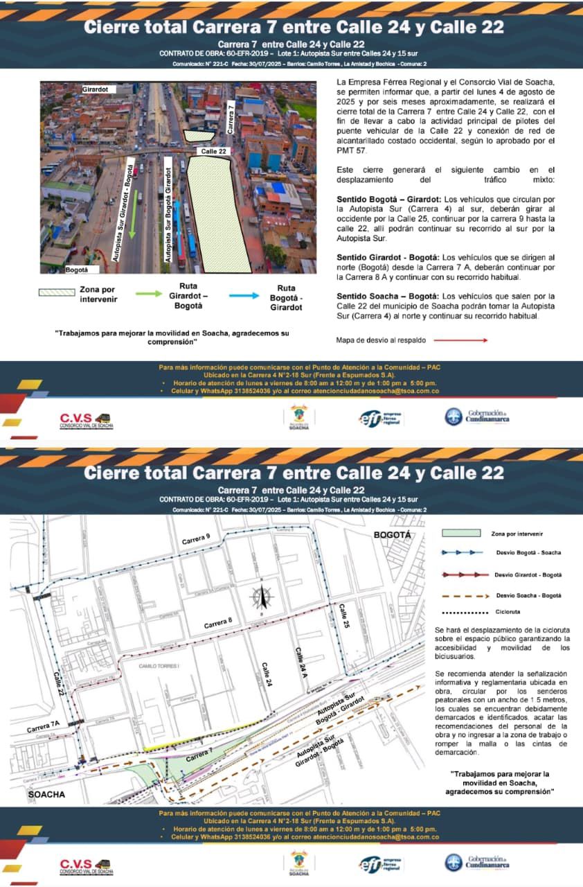Soacha, 1 de agosto de 2025- La Alcaldía de Soacha, en articulación con la Empresa Férrea Regional y el Consorcio Vial de Soacha, informan a la comunidad que a partir del lunes 4 de agosto de 2025 y por un periodo aproximado de seis meses, se realizará el cierre de la Carrera 7 entre las calles 25 y 22, en los barrios Camilo Torres, La Amistad y Bochica, Comuna 2.