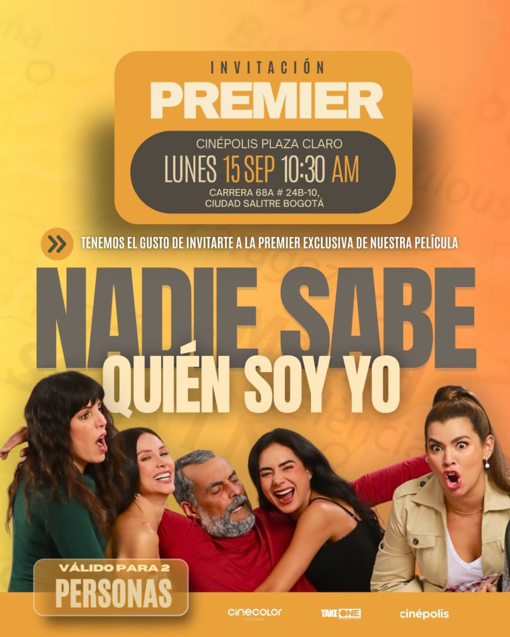 La comedia colombiana Nadie Sabe Quién Soy Yo se estrenará en todos los cines del país el 18 de septiembre de 2025, bajo la distribución de Cinecolor Colombia. Esta hilarante producción promete conquistar al público con enredos, amistad y secretos en una historia llena de humor y sátira.